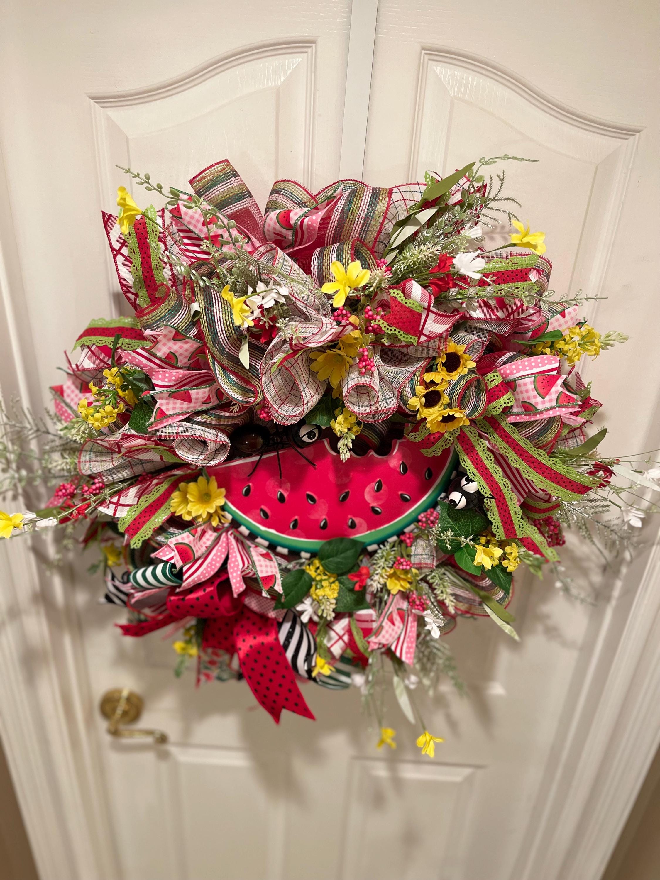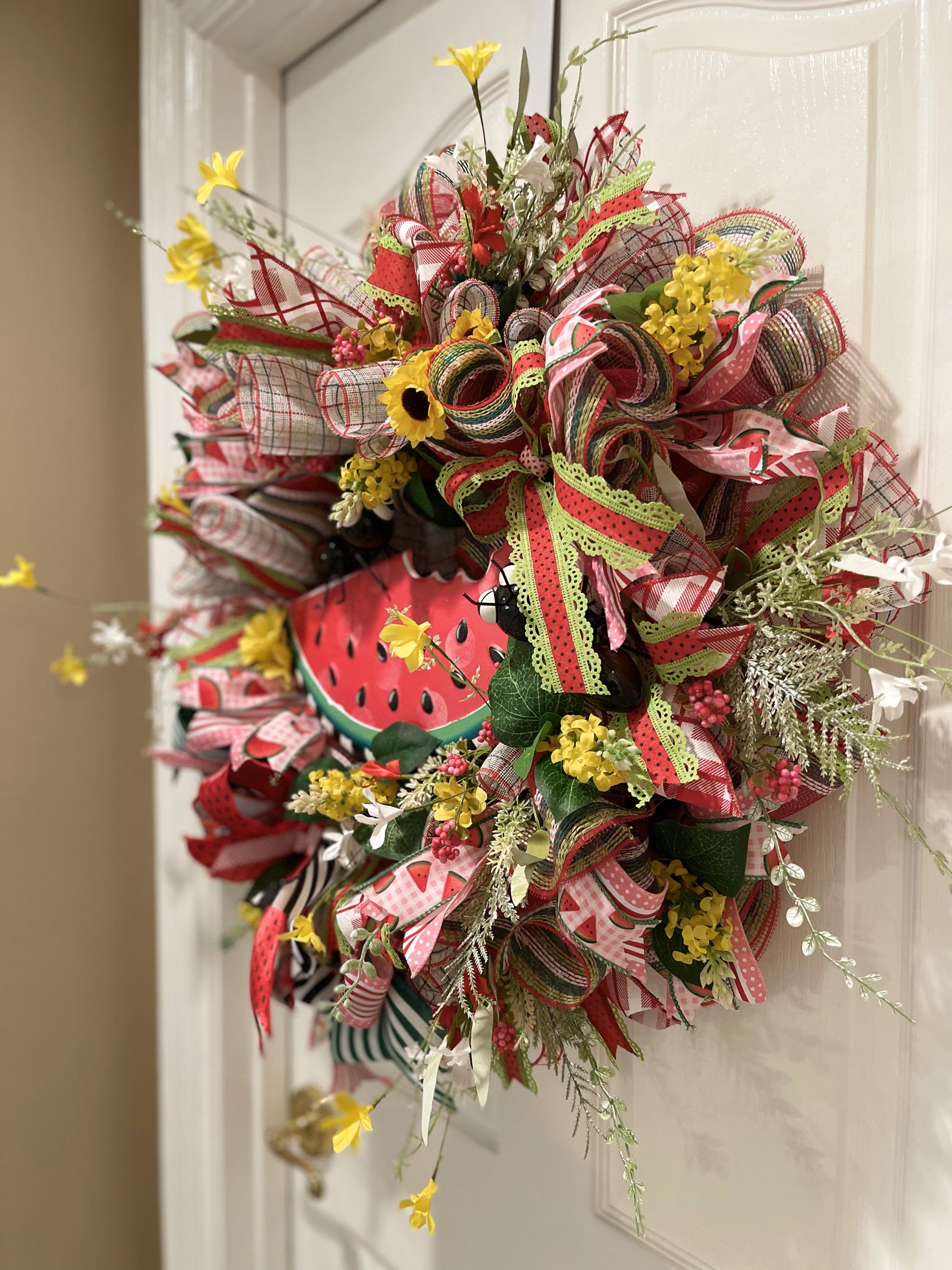 Bring summertime joy right to your front door with this vibrant and whimsical handmade watermelon & ants summer wreath. Bursting with colorful charm, this wreath features a playful watermelon centerpiece surrounded by an explosion of pink, green, and red ribbons, along with cheerful yellow and white florals.