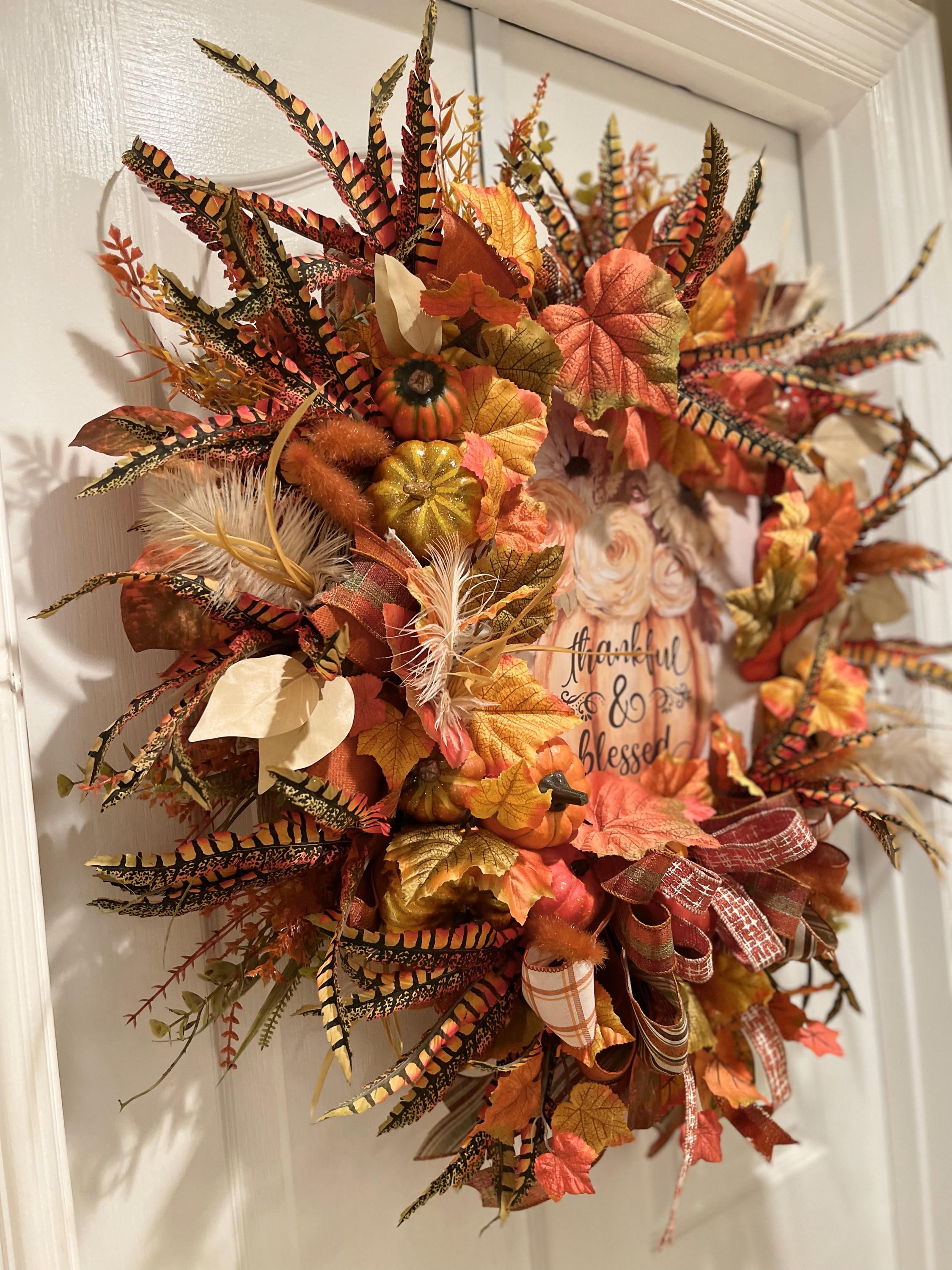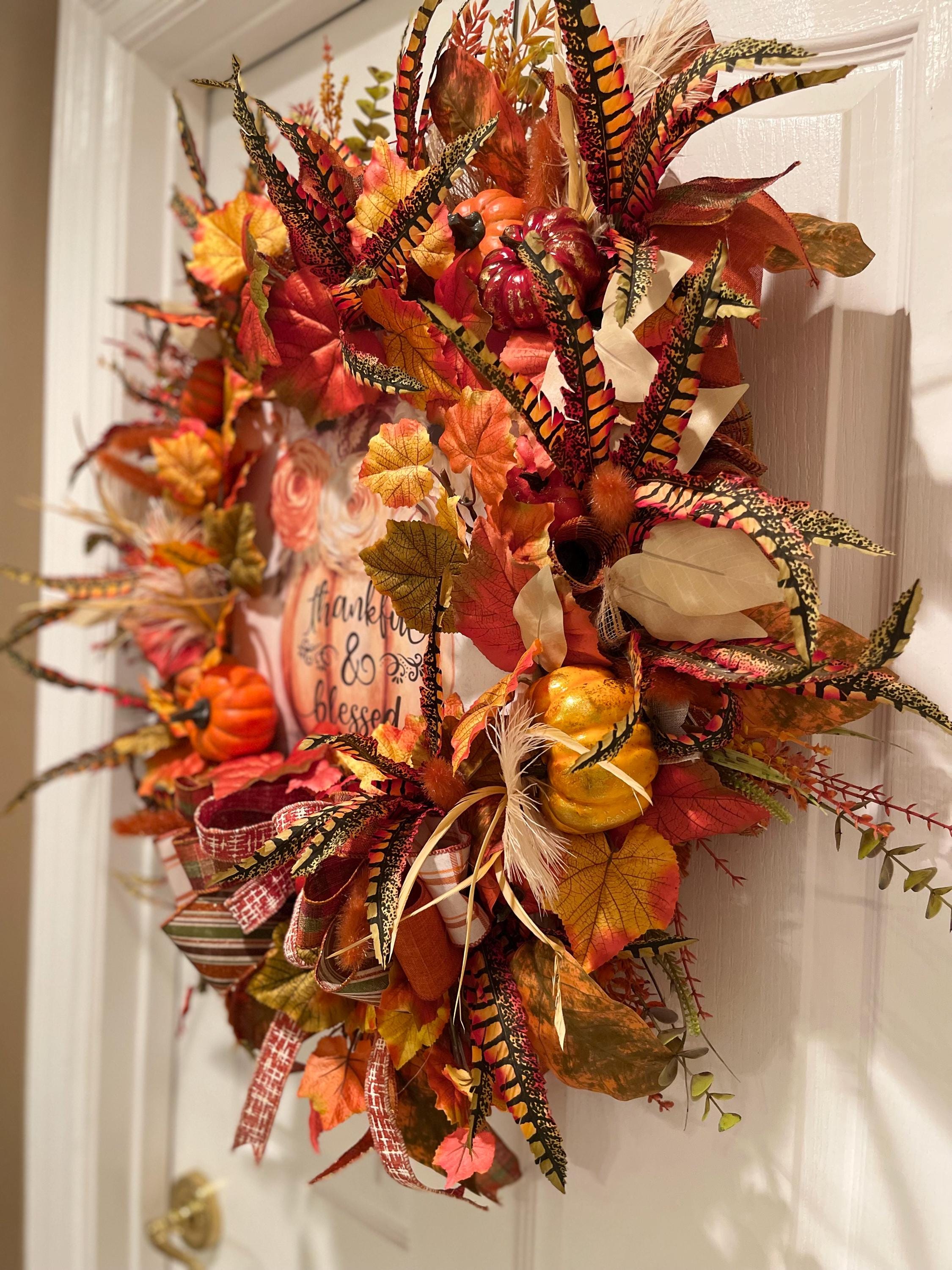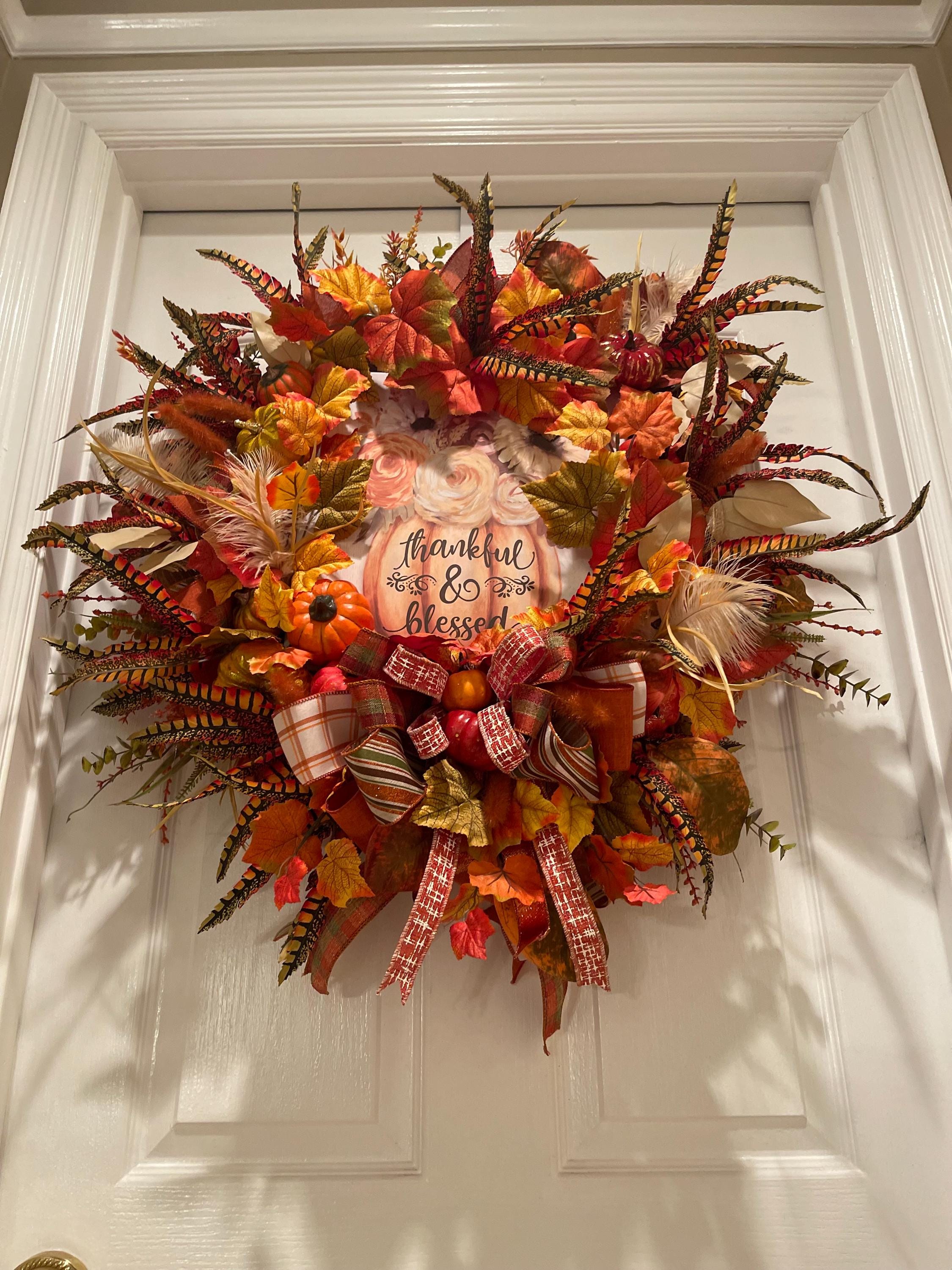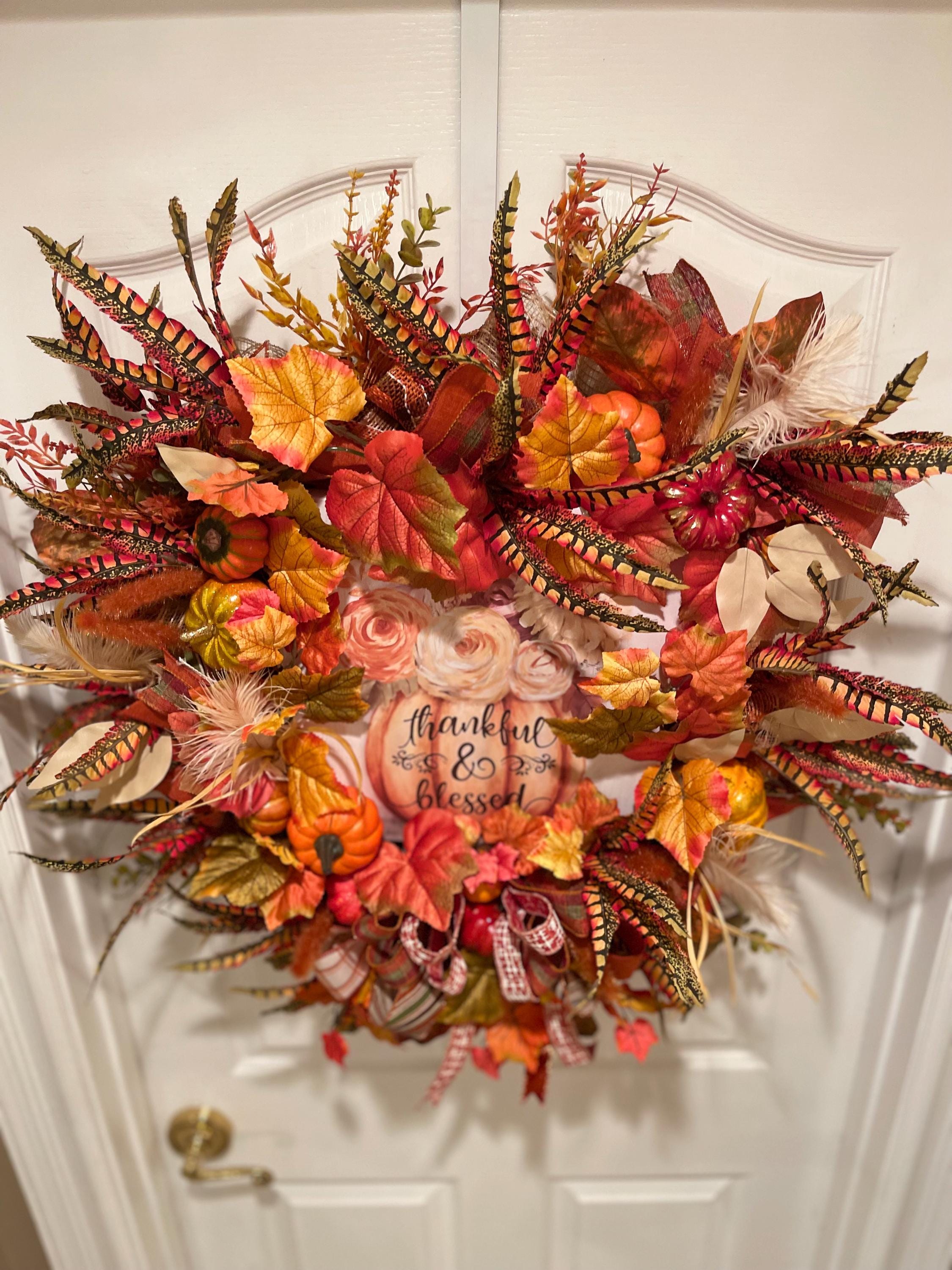 Celebrate the beauty of autumn and the heart of Thanksgiving with this show-stopping "Thankful & Blessed" fall wreath. This lush wreath bursts with the vibrant colors of the season—deep oranges, golden yellows, rich reds, and earthy browns. At the center sits a charming canvas wood-style sign featuring the phrase “Thankful & Blessed,” surrounded by soft ivory roses, faux pumpkins, maple leaves, faux pheasant feathers, and delicate wisps of wheat and pampas.