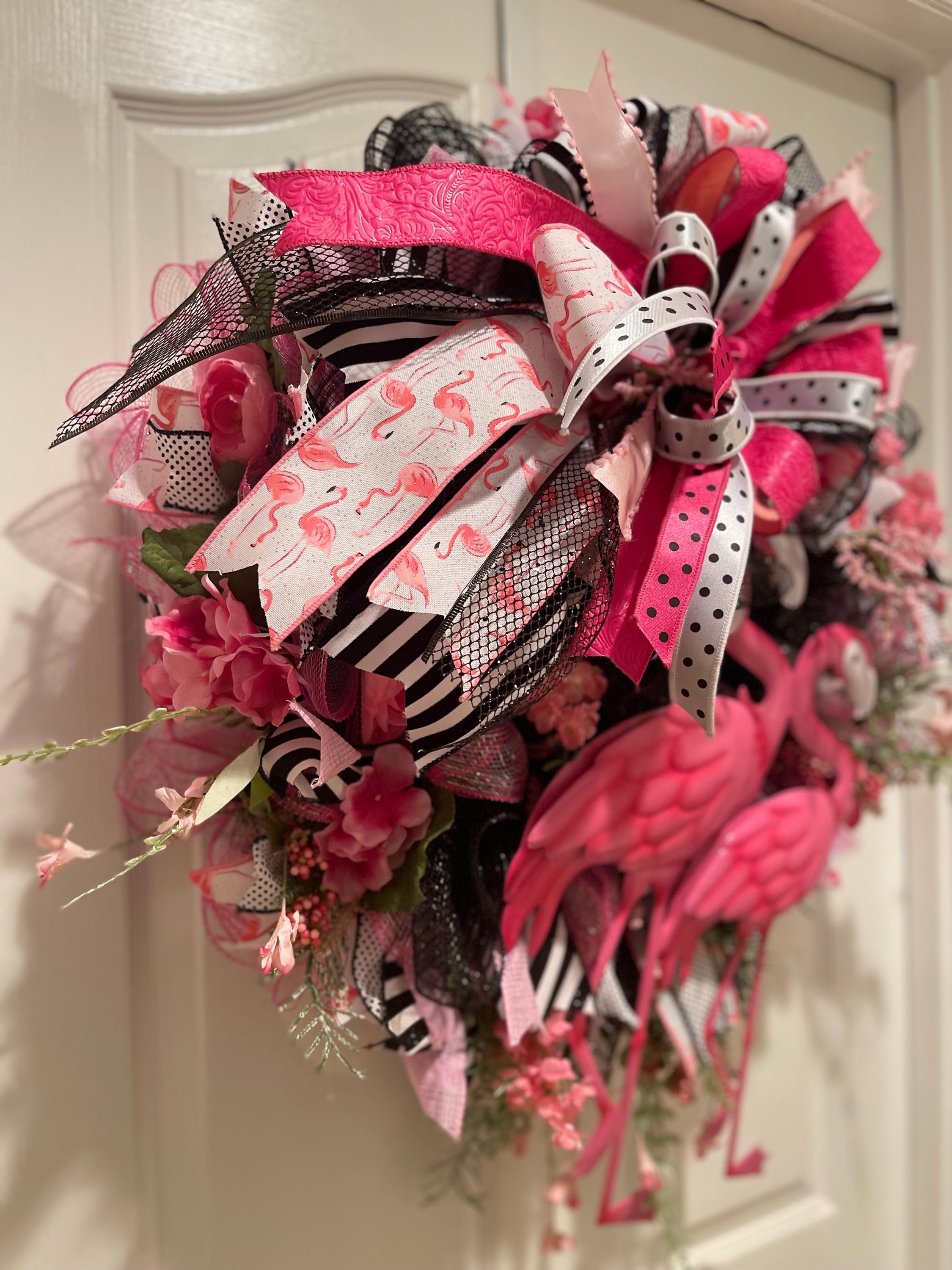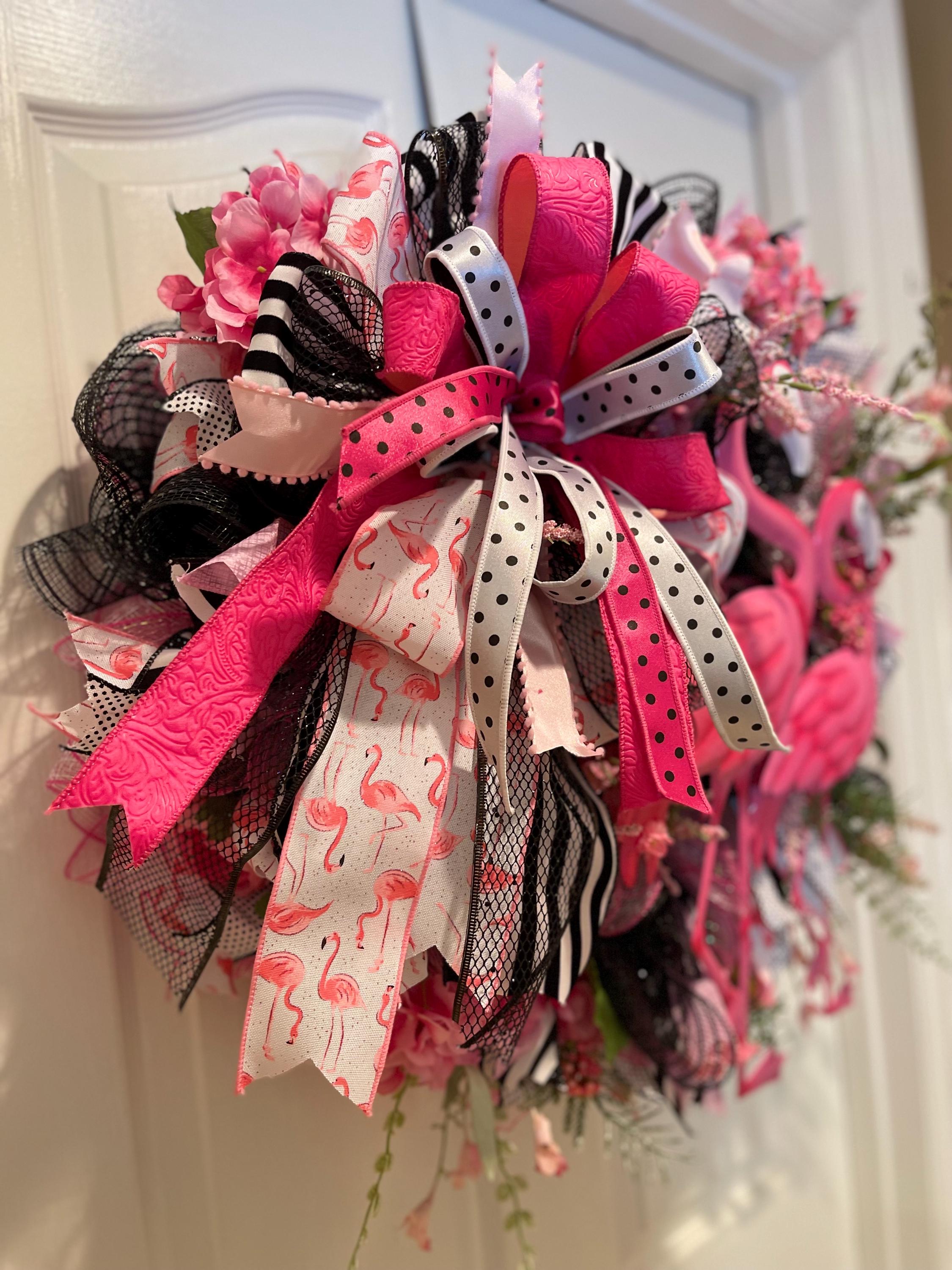 Bring the party to your front door with this fun and fabulous flamingo wreath! Bursting with bold tropical flair, this handmade door hanger features two adorable pink flamingos nestled in a lush arrangement of mesh ribbon, vibrant florals, and a bold bow crafted from a mix of polka dots, stripes, and flamingo-patterned ribbons.