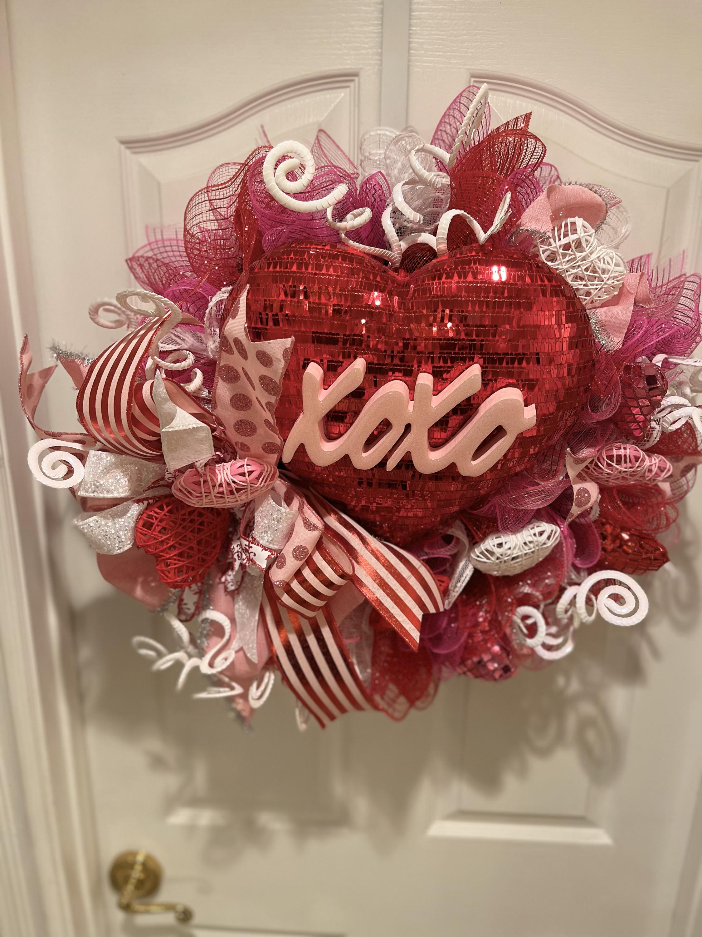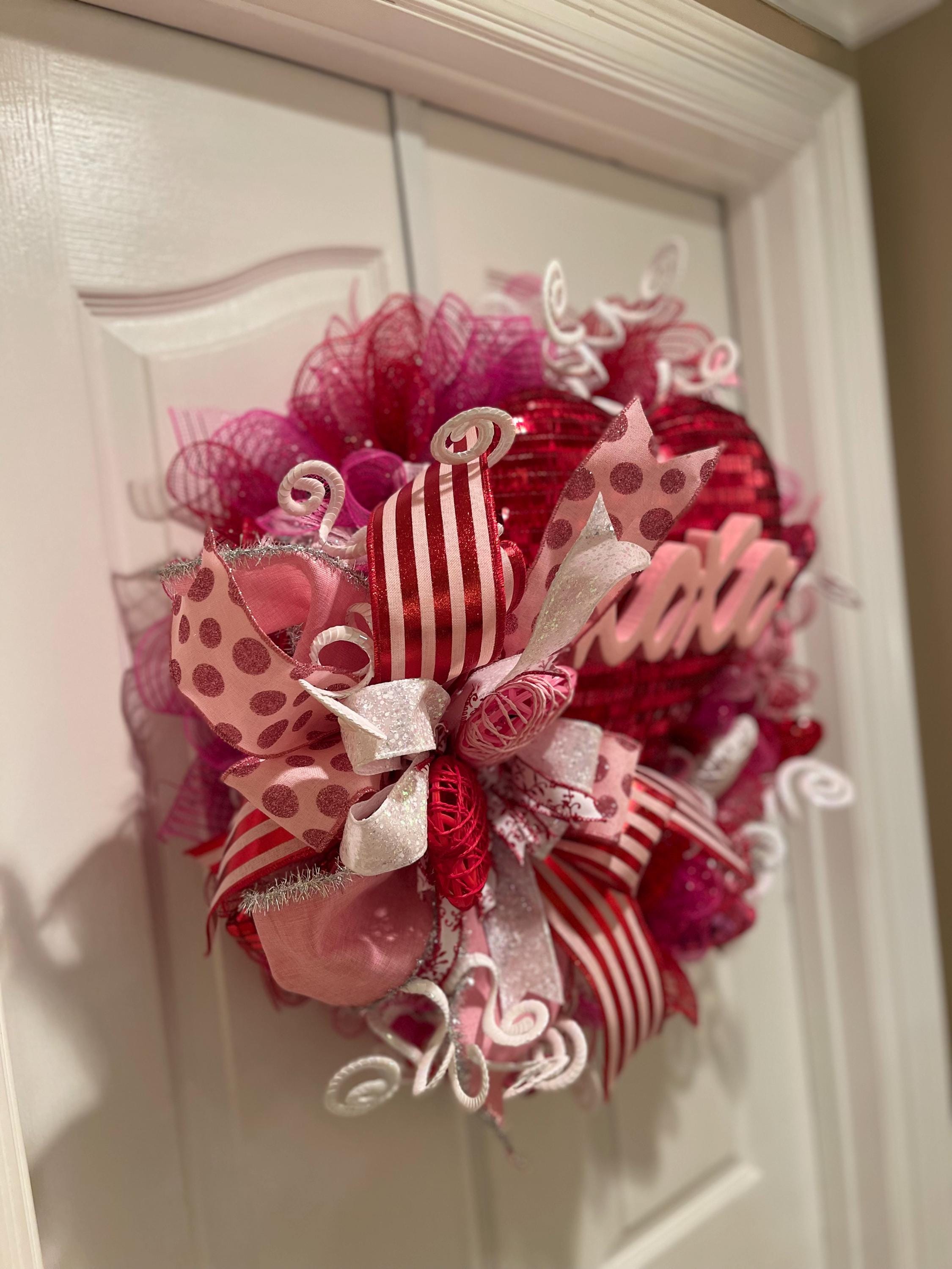 Measuring approximately 24 inches in diameter, this full and festive wreath is crafted on a deco mesh base, combining multiple patterns—polka dots, glitter, stripes—to create an eye-catching statement. Curly sprays and woven hearts add a whimsical, dimensional finish that’s perfect for romantic décor.
