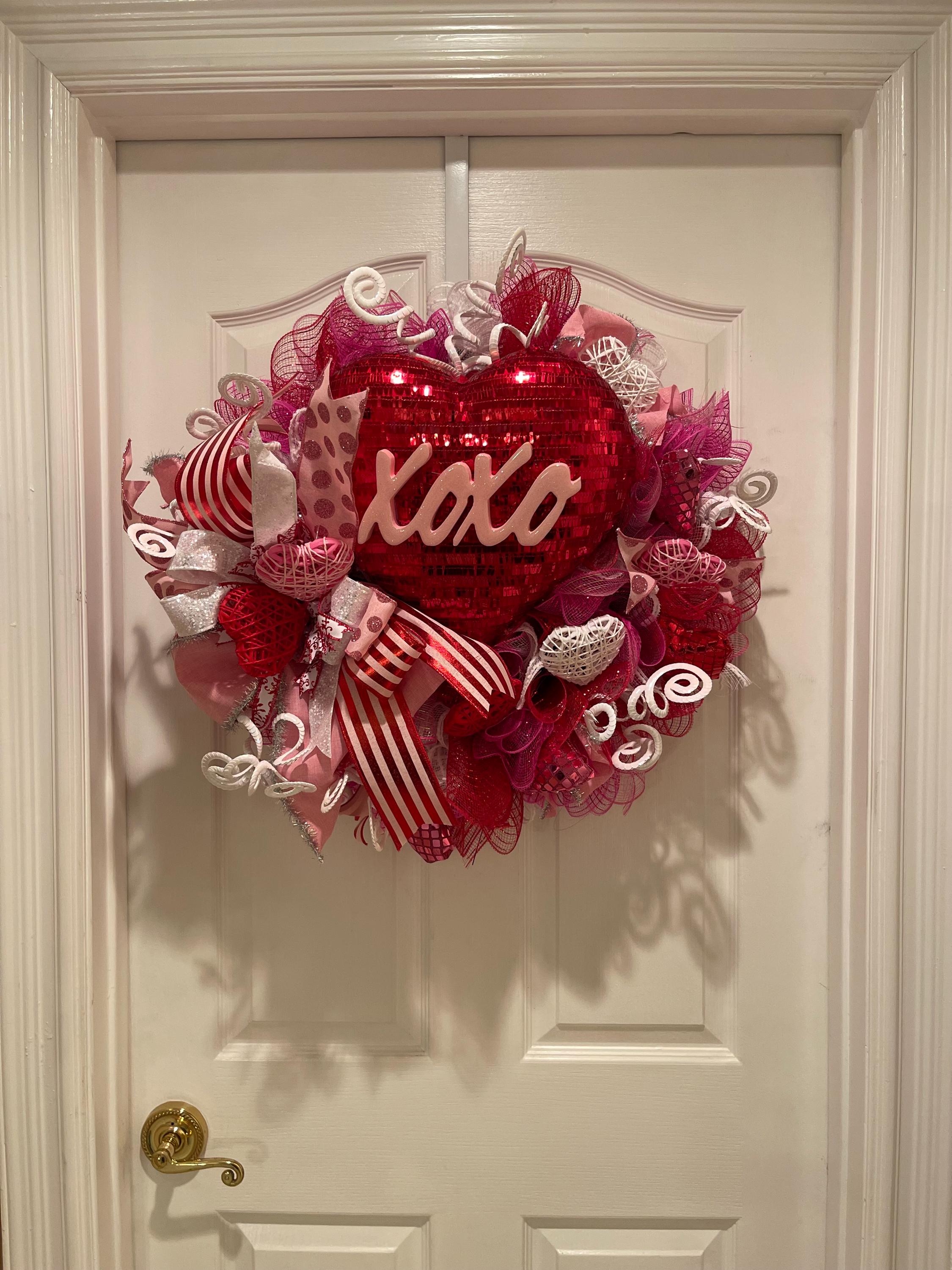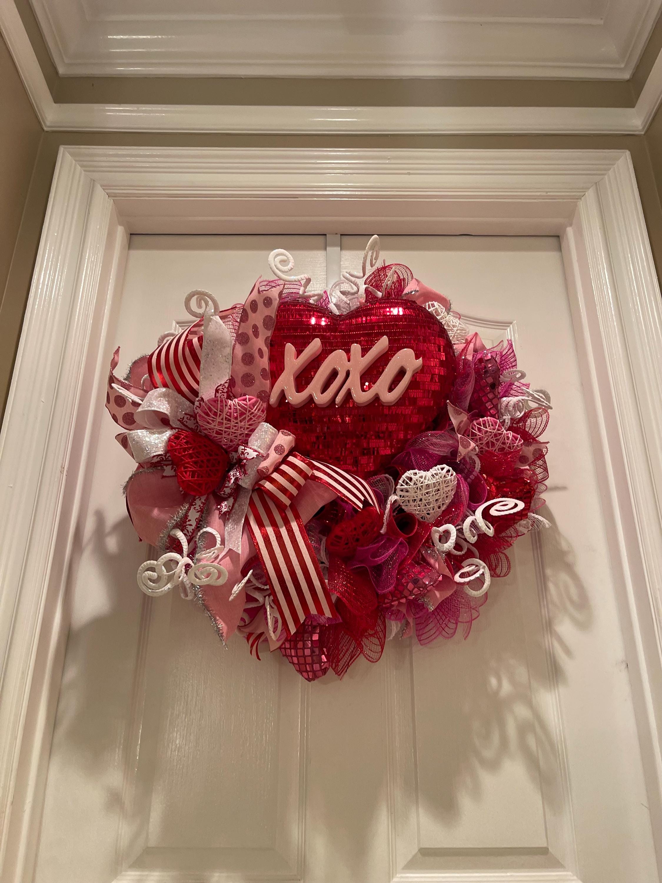 Celebrate love in bold, beautiful style with this handmade Valentine’s Day wreath! Featuring a shimmering red heart with playful "XOXO" script, this vibrant wreath bursts with layered mesh, curly picks, and luxe ribbons in hues of pink, red, and white.