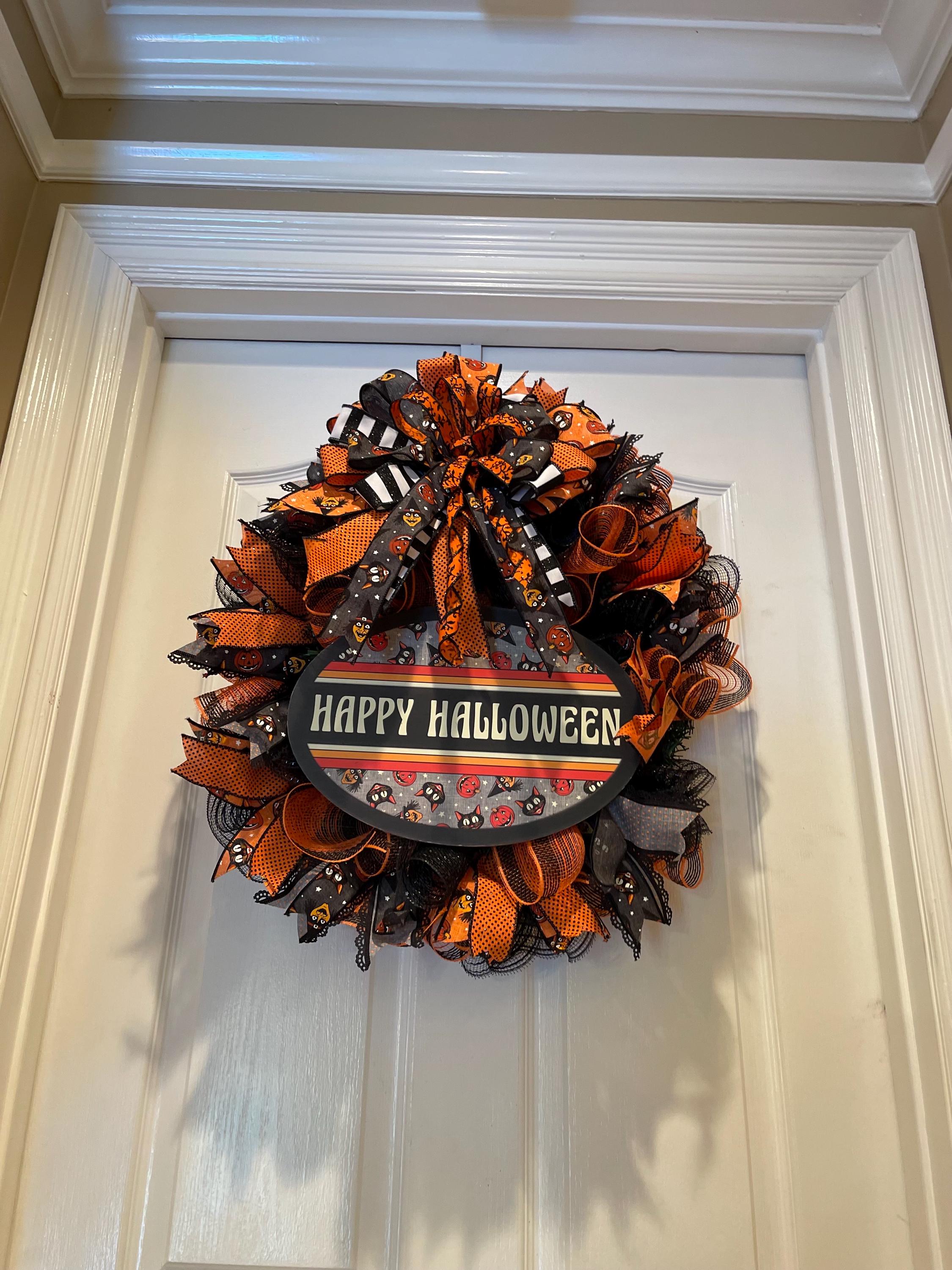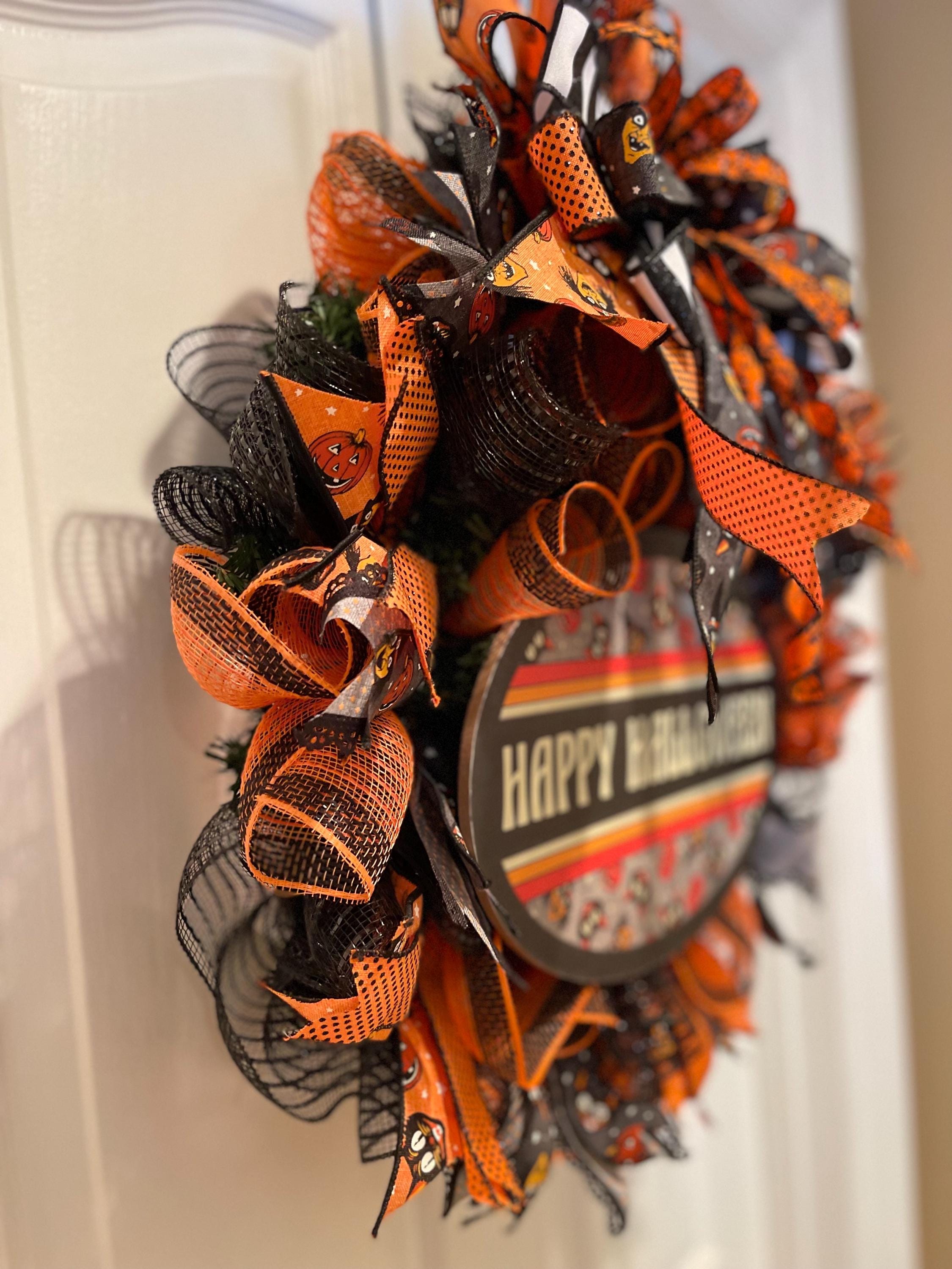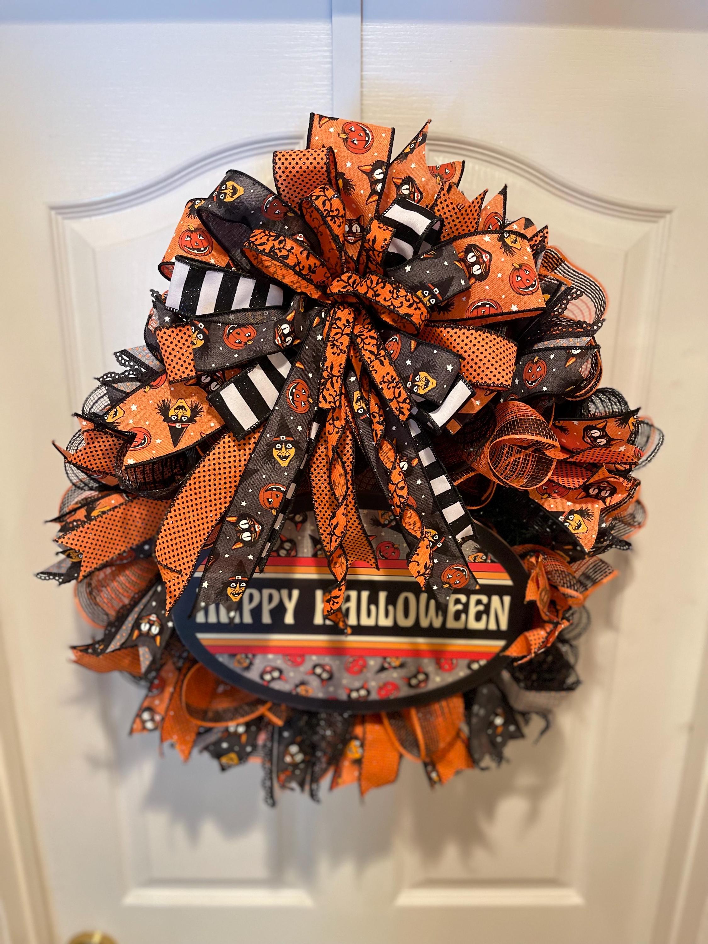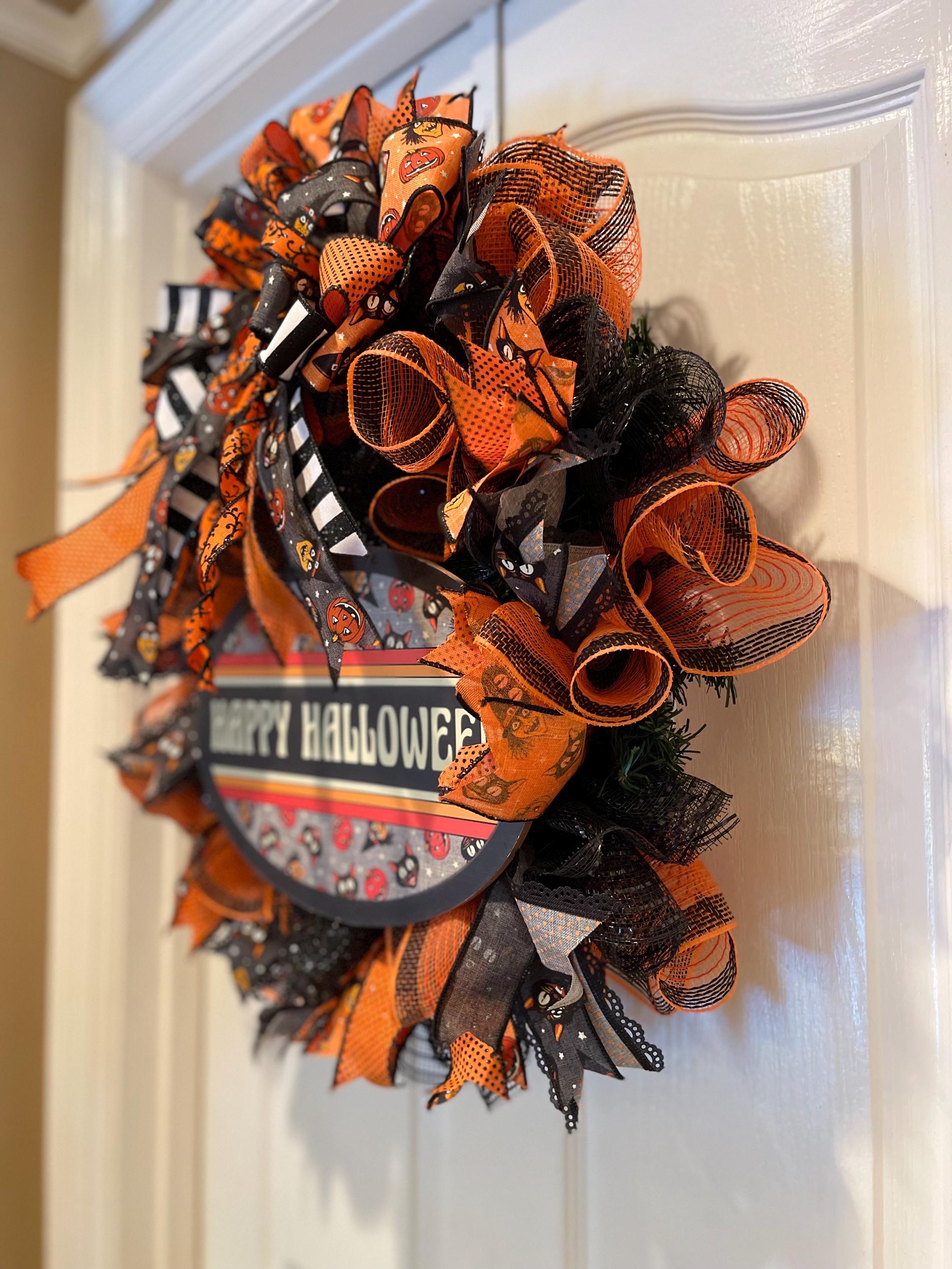 Welcome guests this spooky season with a handmade Halloween wreath that’s full of festive flair. This large, bold wreath features layers of orange and black mesh ribbons, patterned bows with pumpkins and stripes, and a cheerful “Happy Halloween” sign that instantly sets the mood. Every detail is designed to bring fun and spooky spirit to your home, making it a perfect front door decoration for the Halloween season.